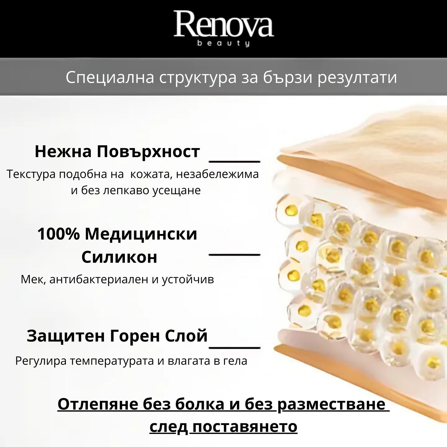 Медицинският силиконов материал имитира естествените свойства на кожата, като насърчава оптималното заздравяване.